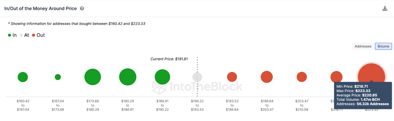 Conforme mostrado abaixo, 56.320 detentores compraram 1,47 milhão de BCH a um preço médio de US$ 220,85. Se decidissem sair de suas posições, poderiam inadvertidamente desencadear um retrocesso.