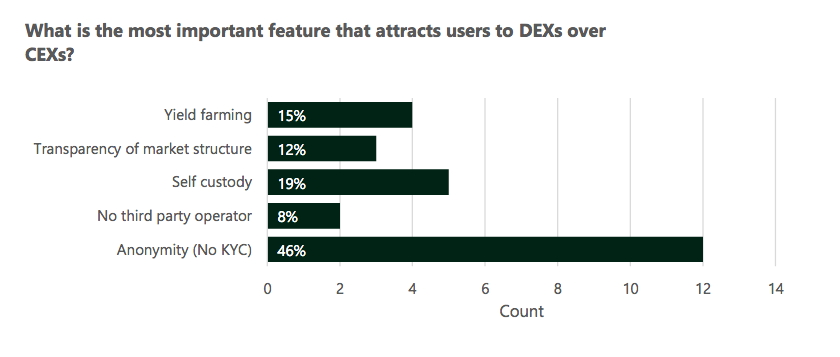 As exchanges centralizadas acreditavam que o anonimato proporcionado pelas DEXs era o principal motivo (46,2%) dos usuários negociarem nas DEXs. O autocuidado foi o fator secundário, com 19,2% dos entrevistados afirmando que esse era um recurso que atraiu usuários para as DEXs.