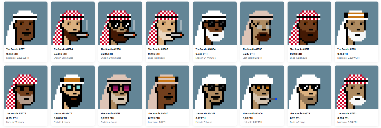 Criada em julho deste ano, o The Saudis é uma coleção de 5.555 itens listados na OpenSea. Cada NFT possui como imagem o avatar de um personagem, de forma semelhante ao visto na coleção CryptoPunks.