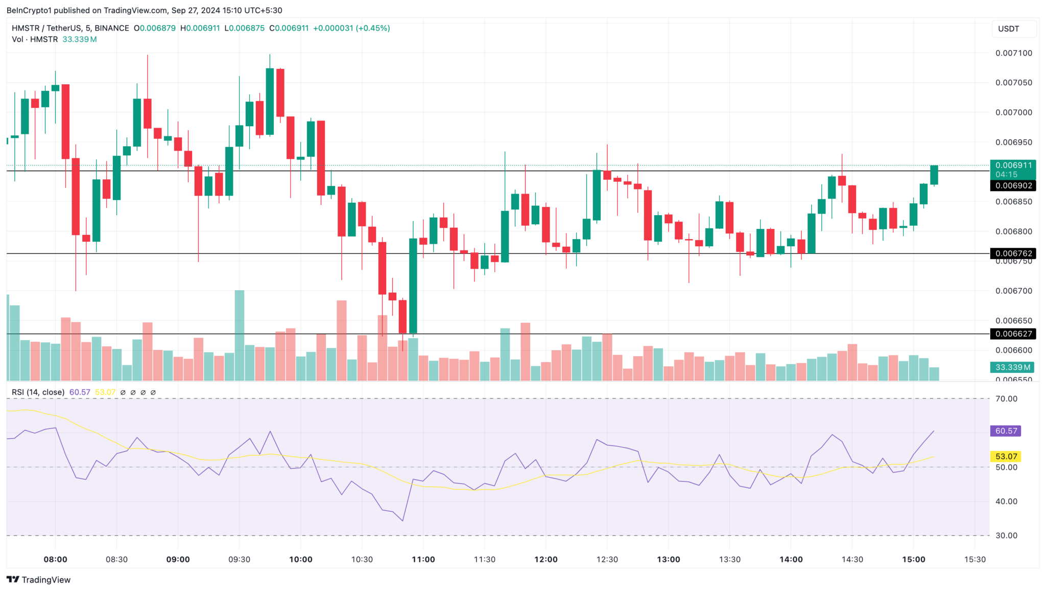 Embora possa ser cedo para prever a movimentação futura de preço do HMSTR, o gráfico de 5 minutos mostra que a criptomoeda encontrou alguma estabilidade em torno de US$ 0,0067 e US$ 0,0069. Além disso, o Índice de Força Relativa (RSI) oscila em torno da linha de sinal neutra de 50.
