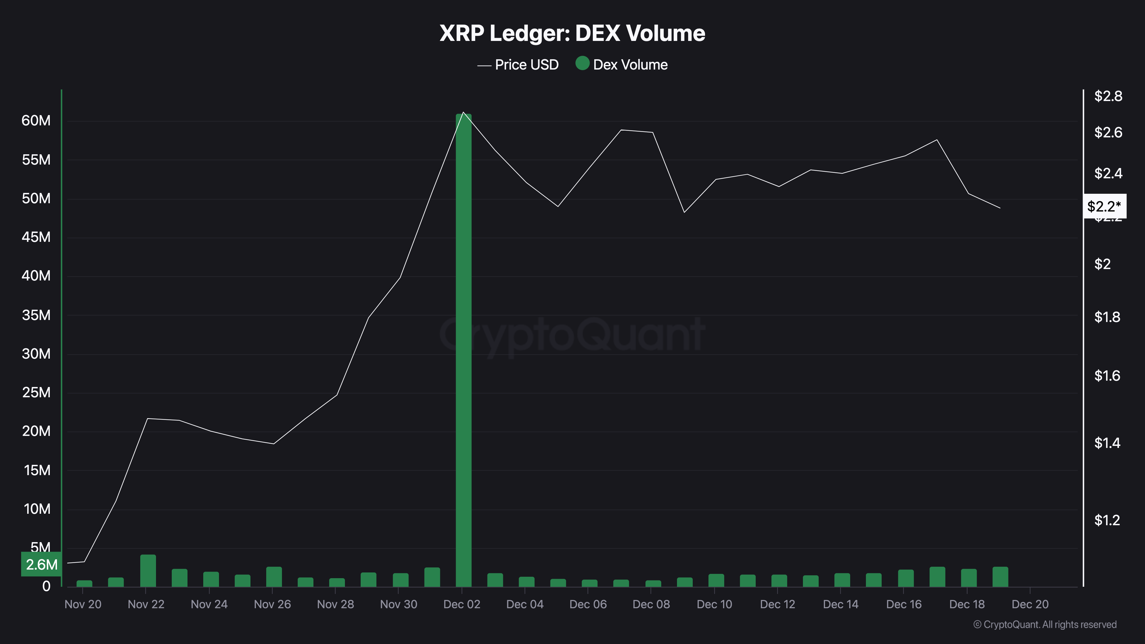 Em 2 de dezembro, o preço do XRP subiu para uma alta de seis anos de US$ 2,72, tornando-se uma das altcoins que superaram o Bitcoin (BTC) neste trimestre. Esse desenvolvimento também ocorreu por volta do mesmo tempo em que o volume do XRP DEX saltou para US$ 61 milhões, com especulações de que o token poderia liderar a temporada de altcoins.