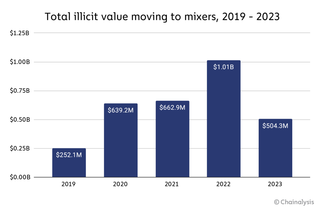 No geral, 2023 assistiu a um declínio nos fundos enviados a misturadores a partir de endereços ilícitos, de US$ 1 bi em 2022 para pouco mais de US$ 500 milhões em 2023.