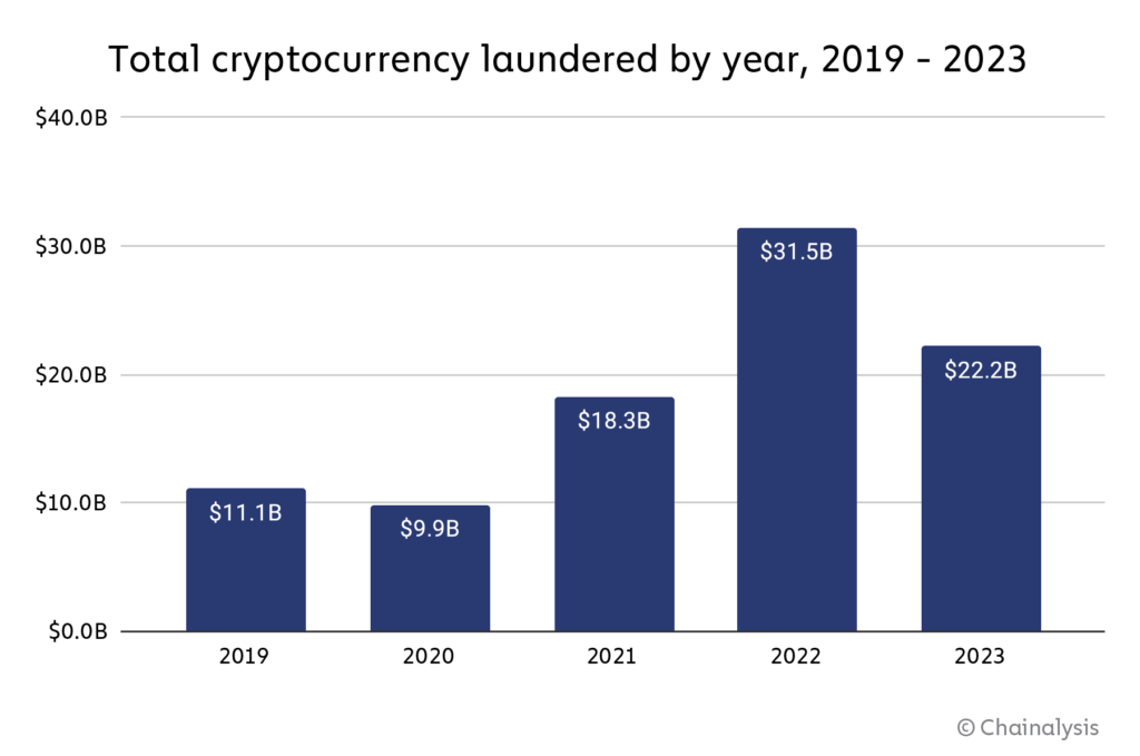 Caiu o volume de dinheiro em criptomoedas lavado por criminosos cibernéticos. Hackers lavaram mais de US$ 22 bilhões em criptomoedas no ano passado. O valor representa uma queda de 30% quando comparado com o recorde de US$ 31,5 bilhões em 2022. As informações estão em mais um capítulo do Crypto Crime Report de 2024, divulgado nesta quinta-feira (15) pela Chainalysis.