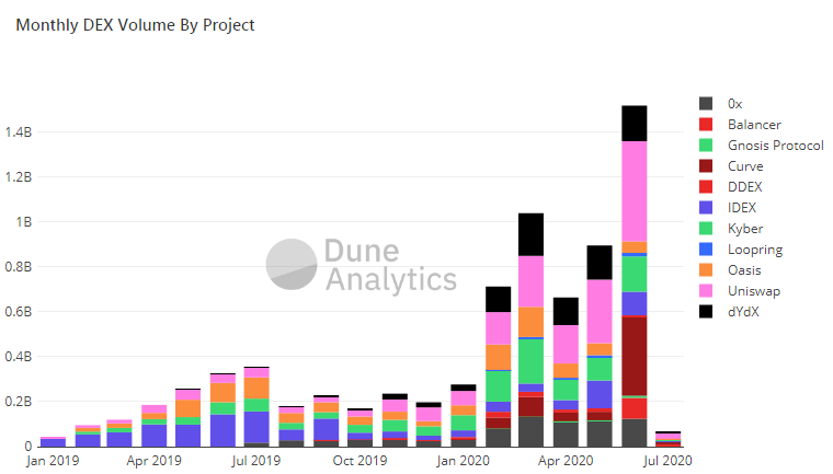 As trocas descentralizadas estão mostrando um tremendo crescimento, conforme os dados do Dune Analytics revelam, o volume em DEX nos primeiros seis meses de 2020 foi cinco vezes maior que no mesmo período de 2019. O ano de 2020 registrou US $ 5,1 bilhões em volume em DEXs, registrando US $ 1,5 bilhão somente em junho.