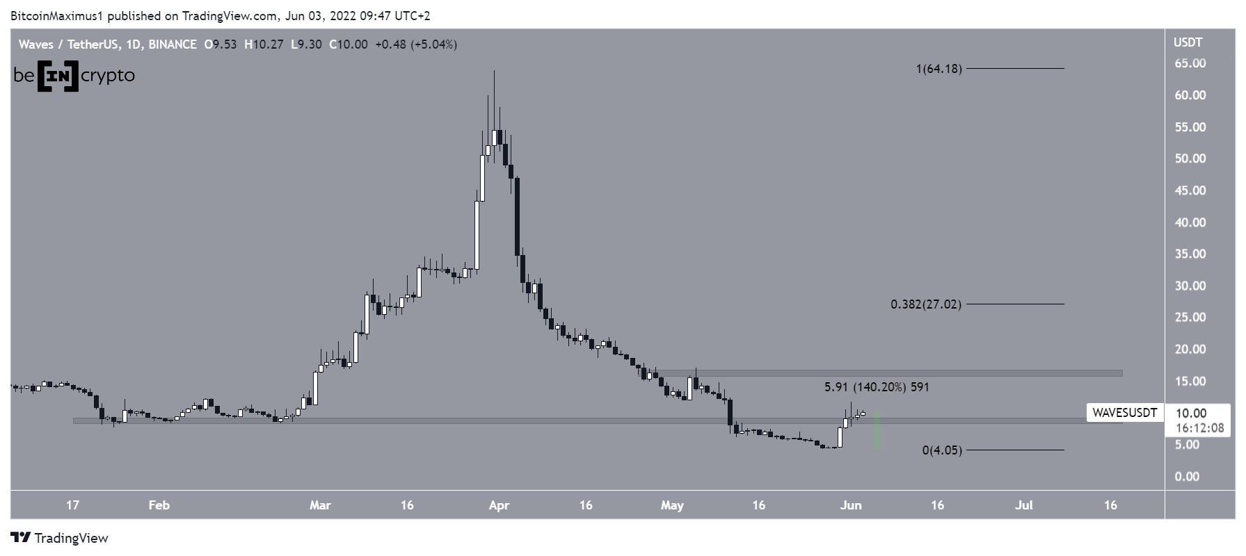A WAVES está em tendência de baixa desde que atingiu o preço recorde de US$ 63,88 em 31 de março. O movimento levou a uma mínima de US$ 4,13 no último domingo (29). Depois disso, o token iniciou um movimento de alta acentuado que ainda está em andamento.