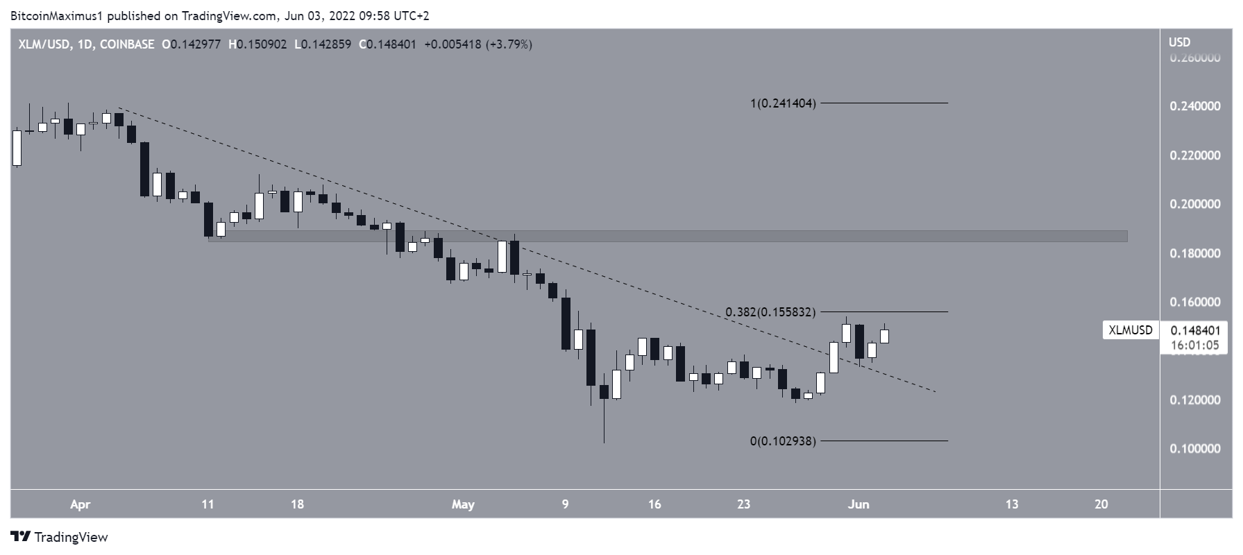 A XLM está caindo abaixo de uma linha de tendência de baixa desde 4 de abril. O movimento levou a uma mínima de US$ 0,10 feita em 12 de maio.