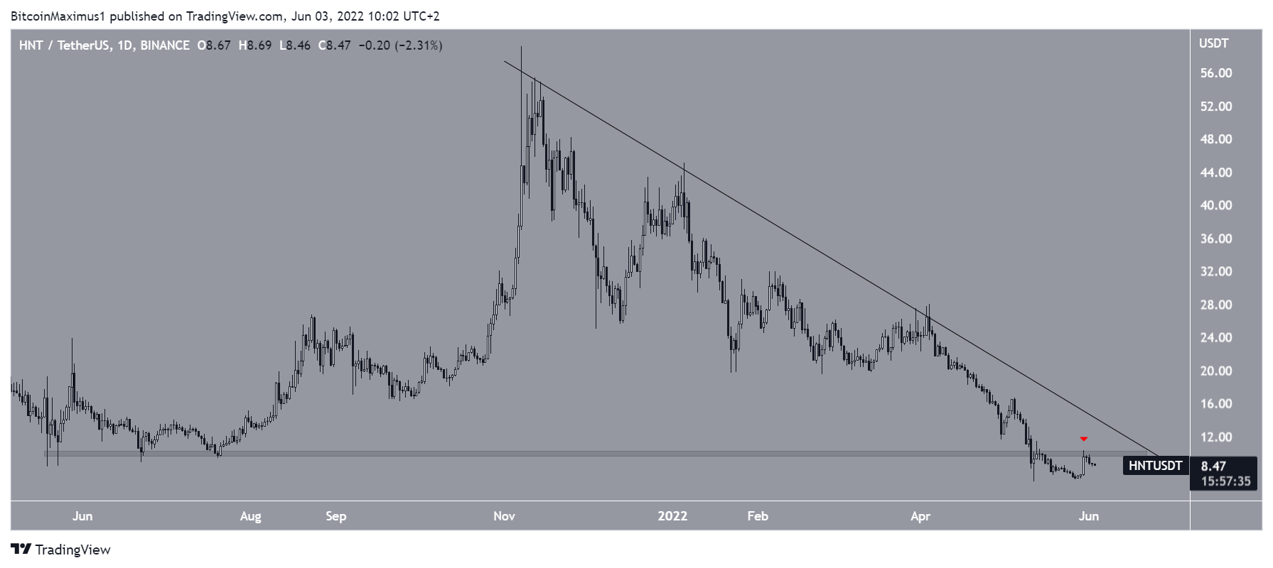 O HNT está caindo abaixo de uma linha de tendência de baixa desde 7 de novembro de 2021. O movimento levou a uma mínima de US$ 6,24 em 12 de maio.