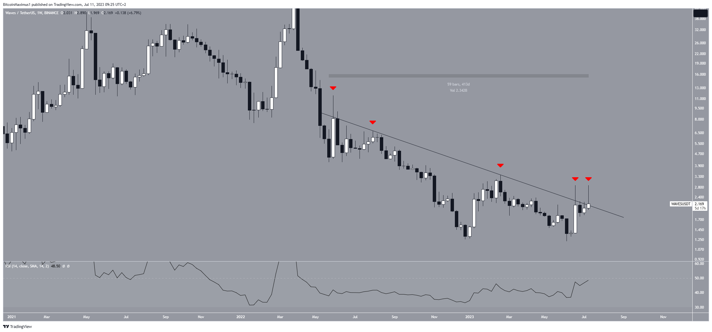 O gráfico semanal mostra que a WAVES caiu abaixo de uma linha de tendência de baixa desde maio de 2022. Assim, a linha está em vigor há 413 dias até agora.
