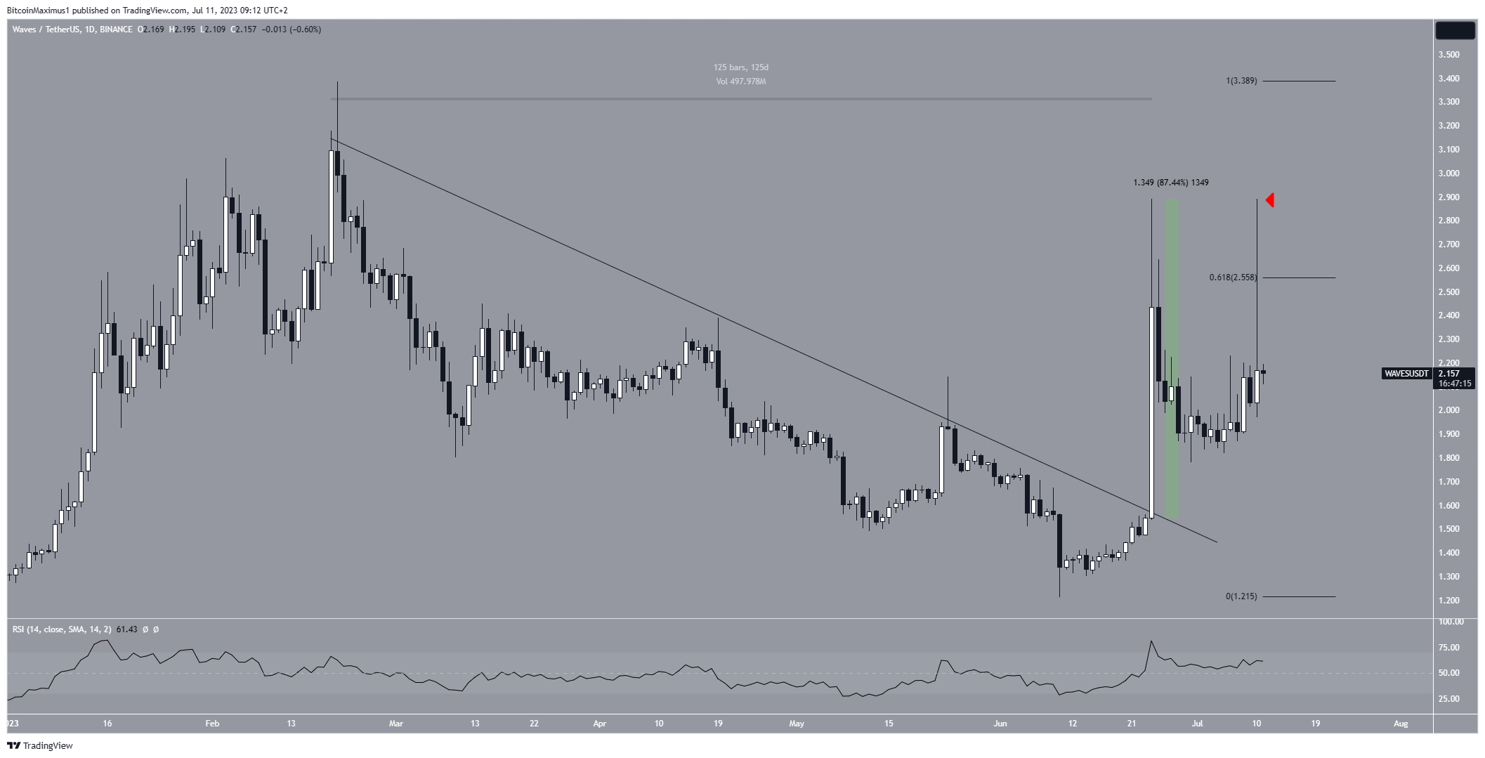 A análise do gráfico diário mostra que a WAVES está em tendência de alta desde que atingiu uma mínima anual de US$ 1,21 em 10 de junho. O movimento acelerou em 24 de junho, causando um rompimento de uma linha de tendência de baixa. No momento desse rompimento, a linha estava em vigor há 125 dias.