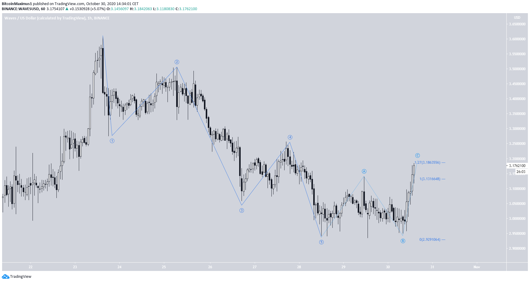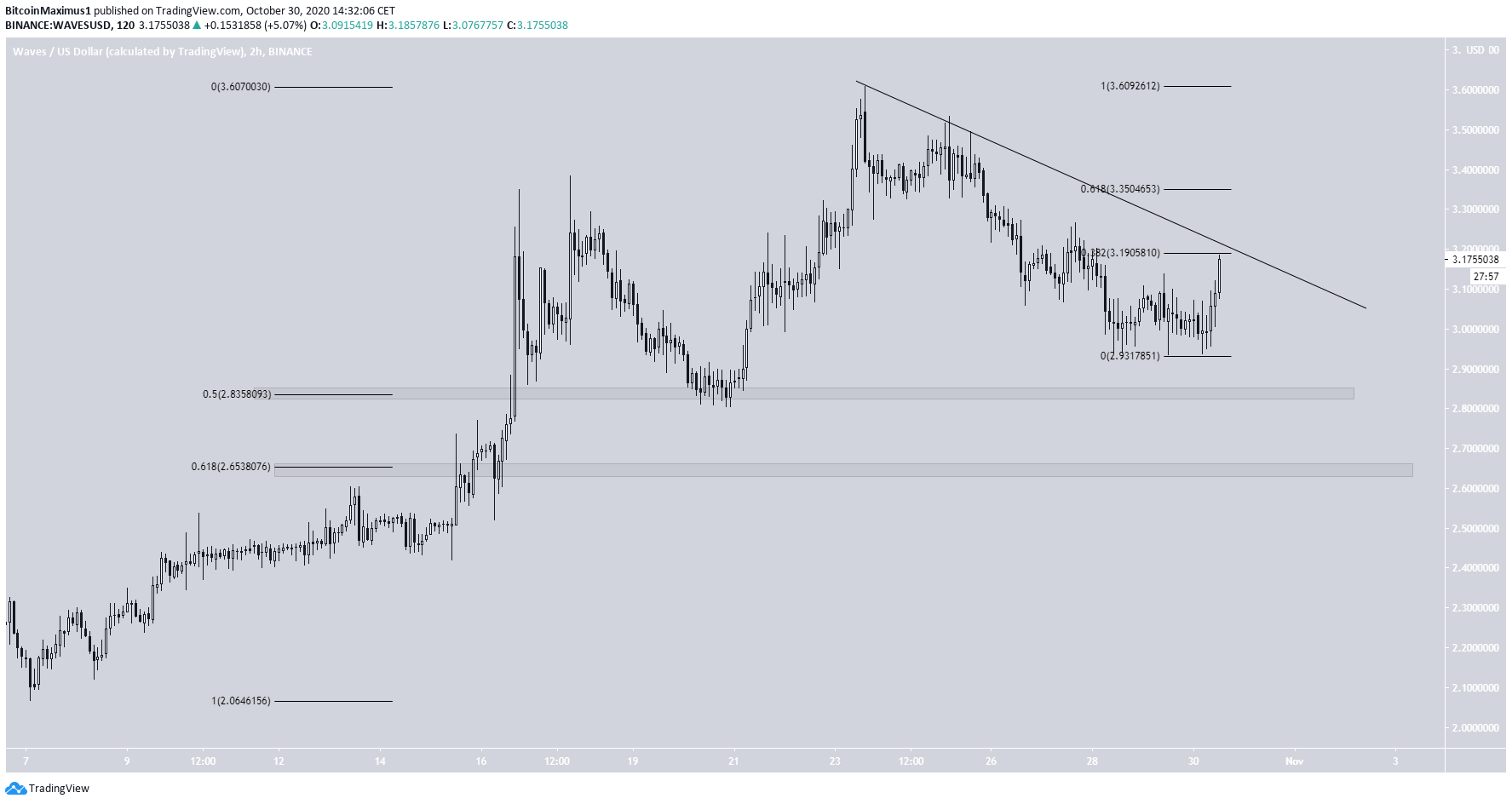 O WAVES está se recuperando desde 21 de setembro, quando o preço atingiu a mínima de US $ 2,07. Até agora, o preço atingiu um topo de US $ 3,61, que ocorreu no dia 23 de outubro.