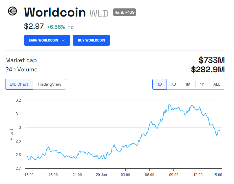Desenvolvimentos recentes fizeram com que o token nativo da Worldcoin, WLD, experimentasse um aumento de 14,44% no valor, subindo de US$ 2,77 para US$ 3,17. No entanto, no momento em que este artigo foi escrito, o preço do WLD recuou para US$ 2,97.