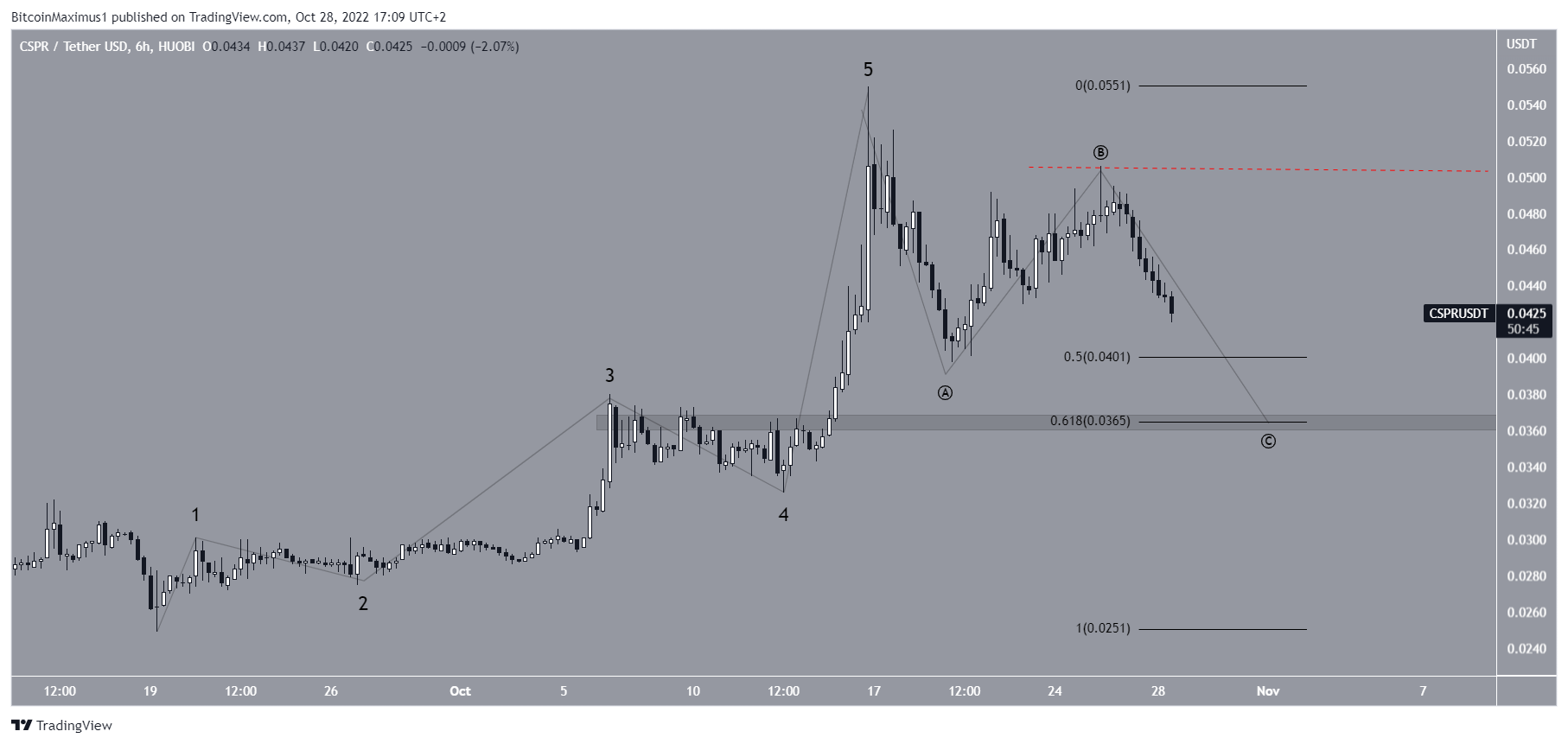 O CSPR vem corrigindo desde 14 de outubro, quando completou um movimento de alta de cinco ondas em US$ 0,055. Esse movimento se assemelha a uma estrutura A-B-C. Em caso afirmativo, o token estaria na onda C atualmente.