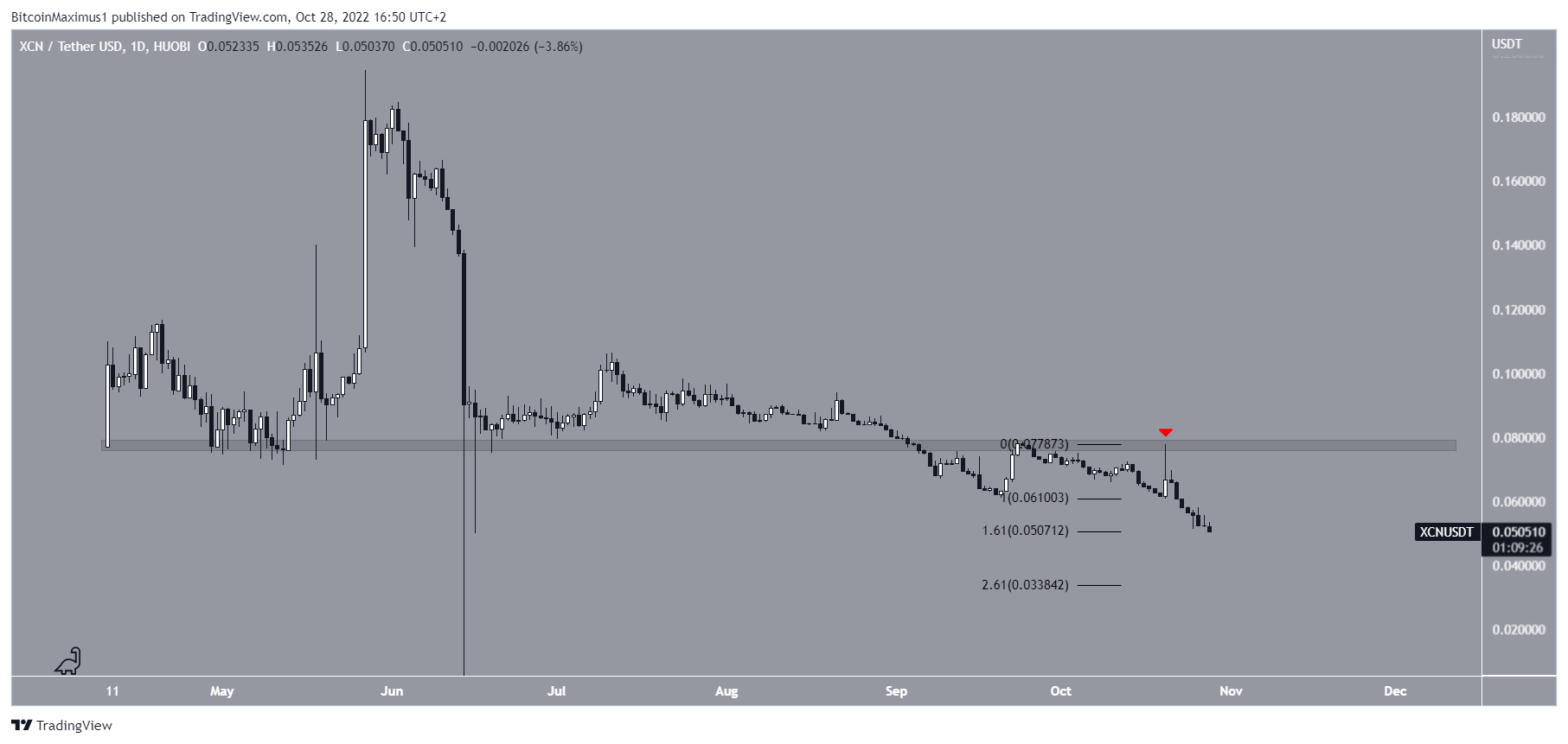 Em 6 de setembro, o XCN caiu abaixo da área horizontal de US$ 0,079, que atuava como suporte desde abril. Depois, validou essa mesma área como resistência (ícone vermelho) em 20 de outubro.