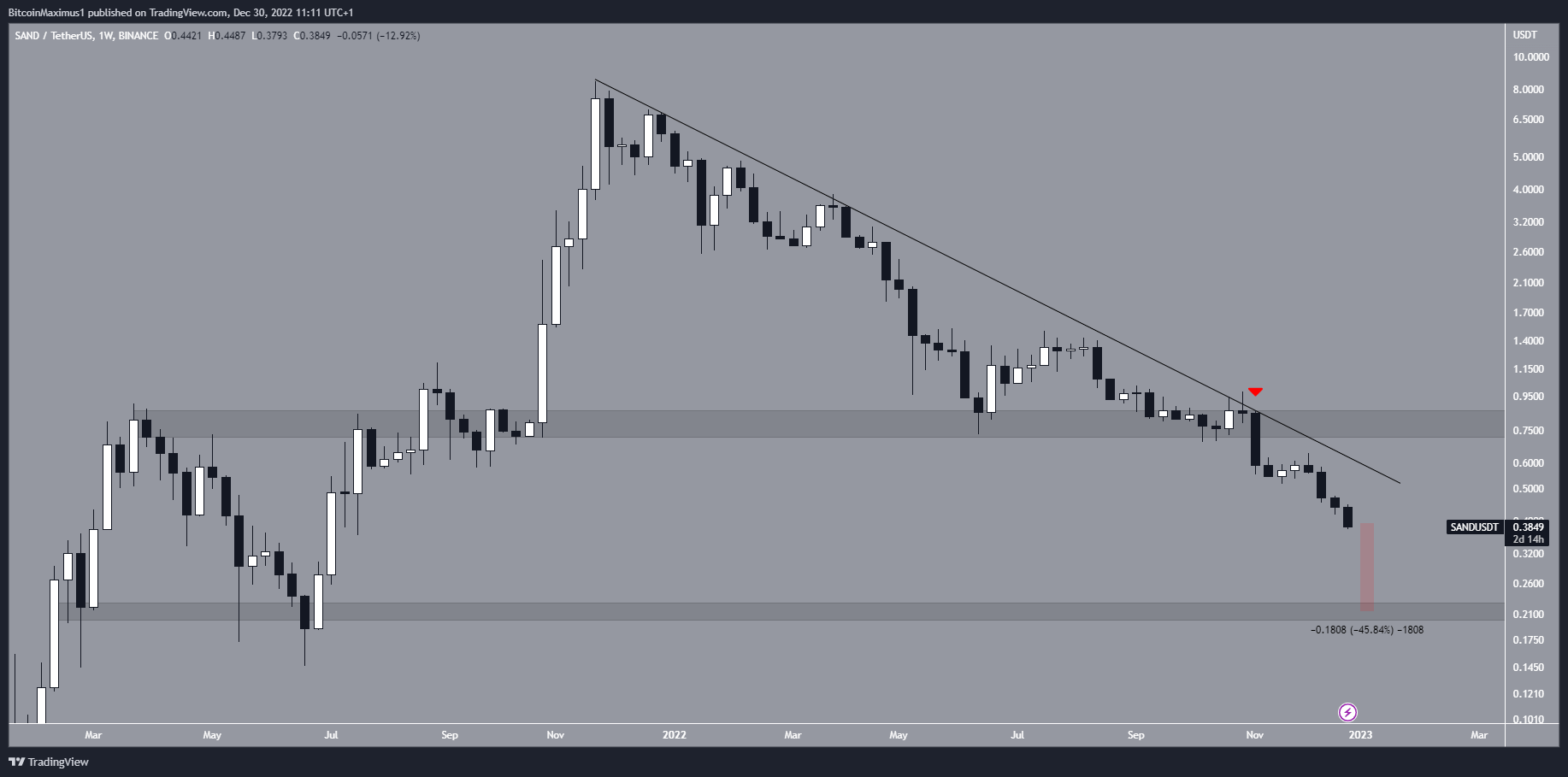 A SAND caiu abaixo de uma linha de resistência descendente desde que atingiu a máxima histórica de US$ 7,94 em novembro de 2021. A linha causou uma rejeição na primeira semana de novembro (ícone vermelho), rompendo a área de suporte horizontal de US$ 0,80 no processo. Isso levou a uma mínima de US$ 0,38 em 29 de dezembro.