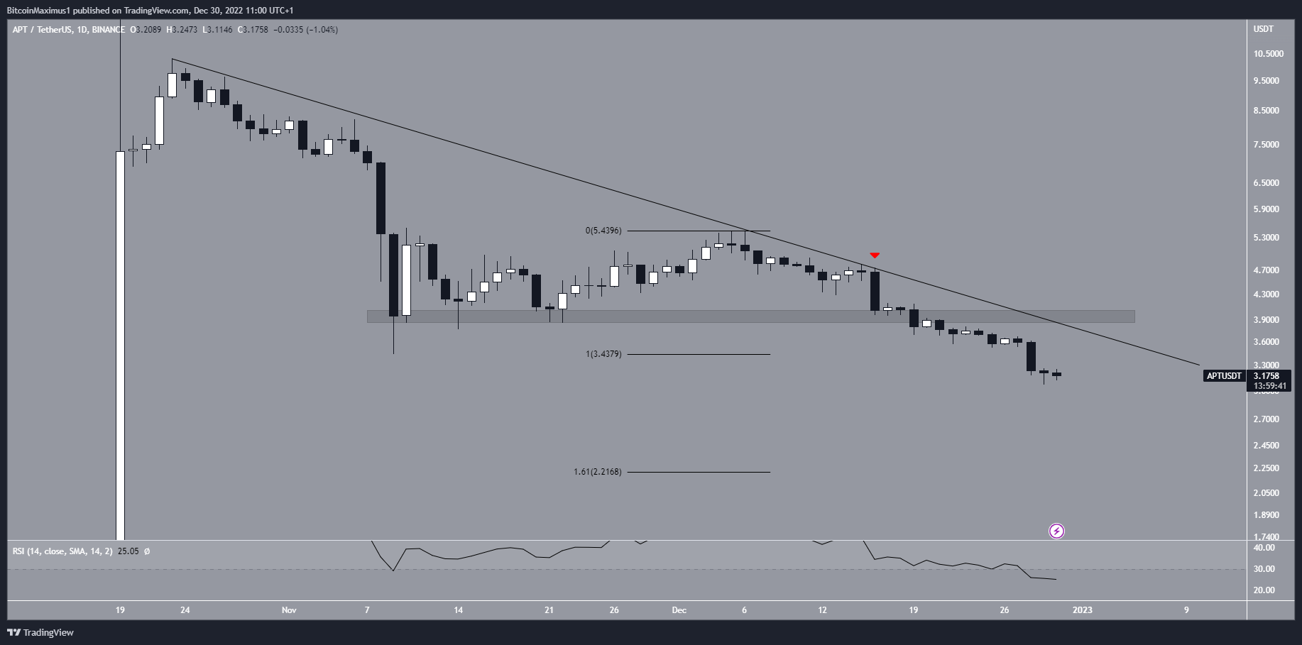 O APT caiu abaixo de uma linha de resistência descendente desde 23 de outubro. Mais recentemente, a linha causou uma rejeição em 16 de dezembro (ícone vermelho) e quebrou a área de suporte de US$ 3,95 no dia seguinte. Este é um desenvolvimento importante, uma vez que a área existe desde 8 de novembro.