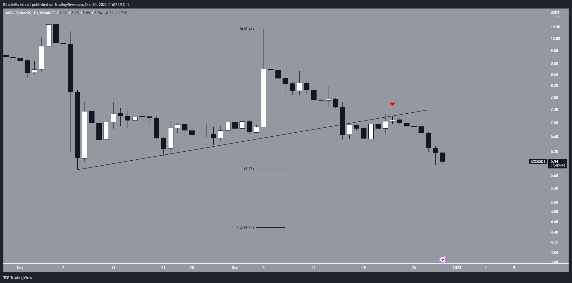 O AXS aumentou junto com uma linha de suporte ascendente desde 9 de novembro. Esse movimento ascendente levou a uma alta de US$ 10,40 em 5 de dezembro. No entanto, o preço caiu desde então e quebrou a linha de suporte ascendente em 16 de dezembro.