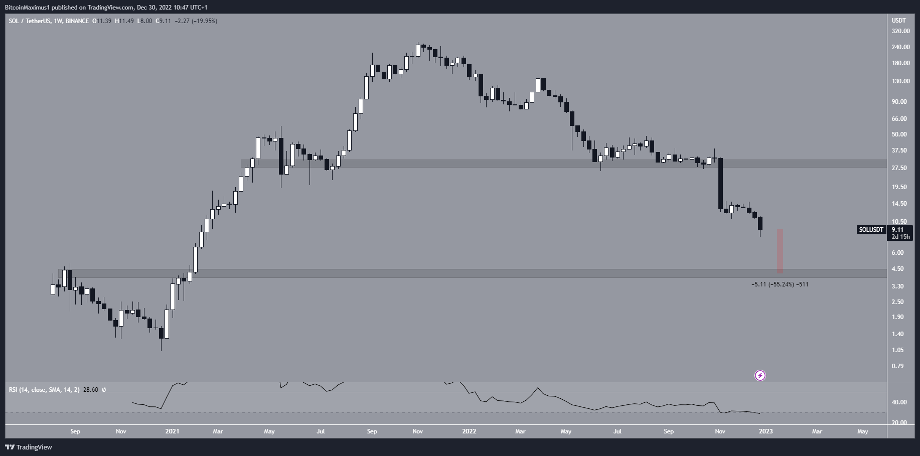 A SOL caiu da área de suporte horizontal de US$ 30 durante a primeira semana de novembro. O movimento de queda foi rápido, levando a uma mínima de US$ 8 em 30 de dezembro.