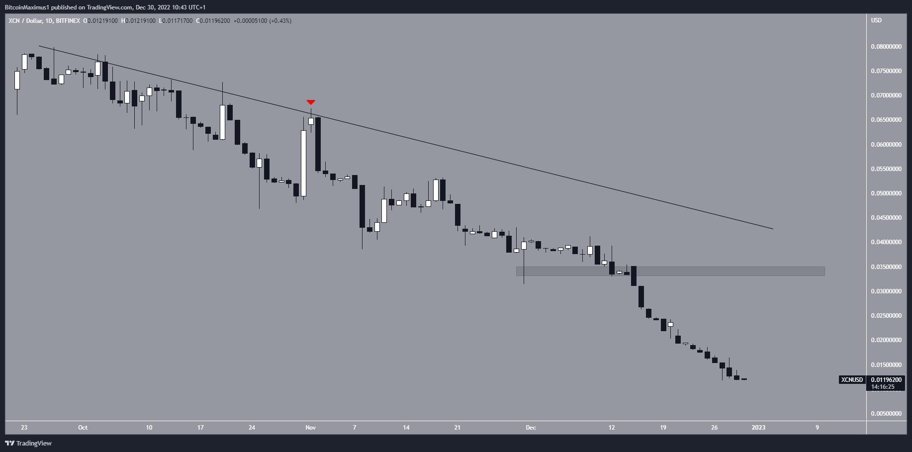 A XCN caiu abaixo de uma linha de resistência descendente desde 27 de setembro. A linha causou uma rejeição em 1º de novembro (ícone vermelho) levando à aceleração do movimento de queda. Isso levou a uma nova mínima histórica de US$ 0,011 em 30 de dezembro.