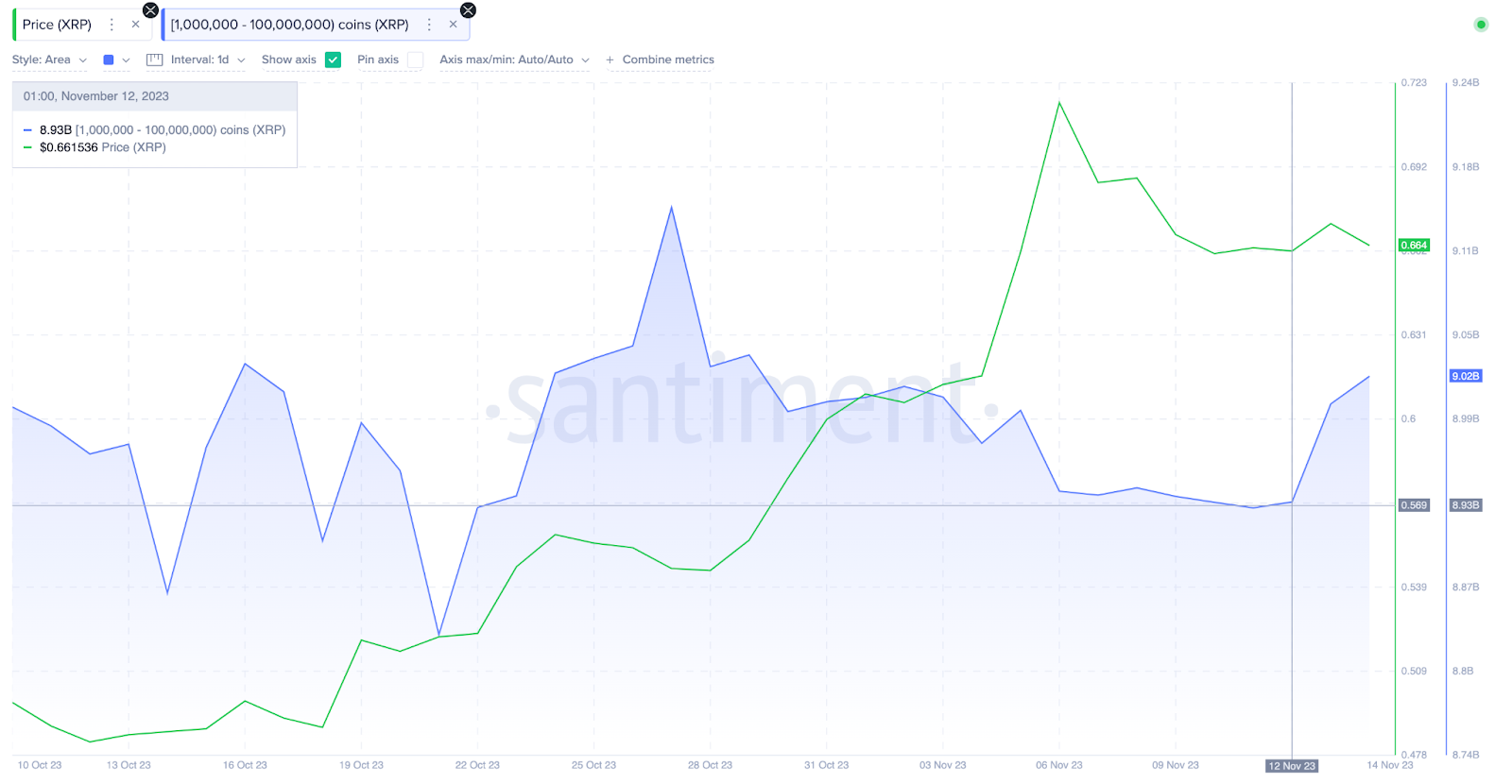De acordo com o gráfico da Santiment abaixo, as baleias (carteiras com 1 milhão a 100 milhões de XRP) tinham apenas 8,93 bilhões de moedas em seus saldos acumulados no fechamento do último domingo (12).