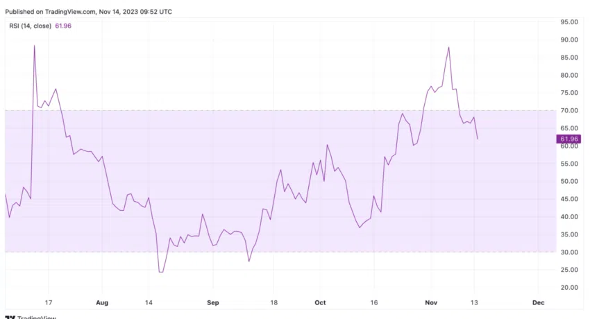 No entanto, após uma semana de consolidação em que os ursos forçaram um recuo para US$ 0,65, o RSI caiu agora para a zona neutra em 61,96.
