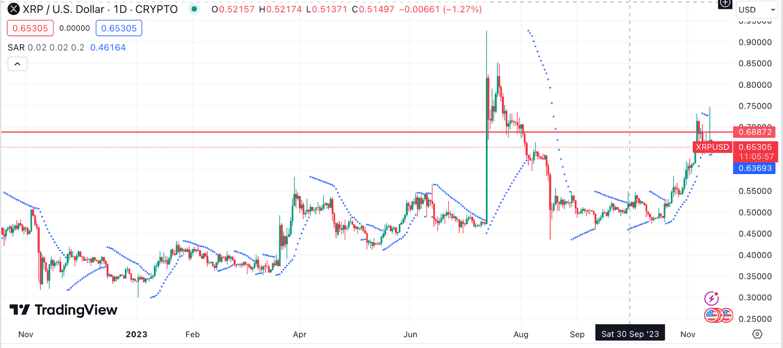 Tendo defendido o território de US$ 0,65, o XRP segue firme em sua tendência de alta. O indicador de análise técnica Parabolic SAR (Stop and Reverse) apoia essa previsão.