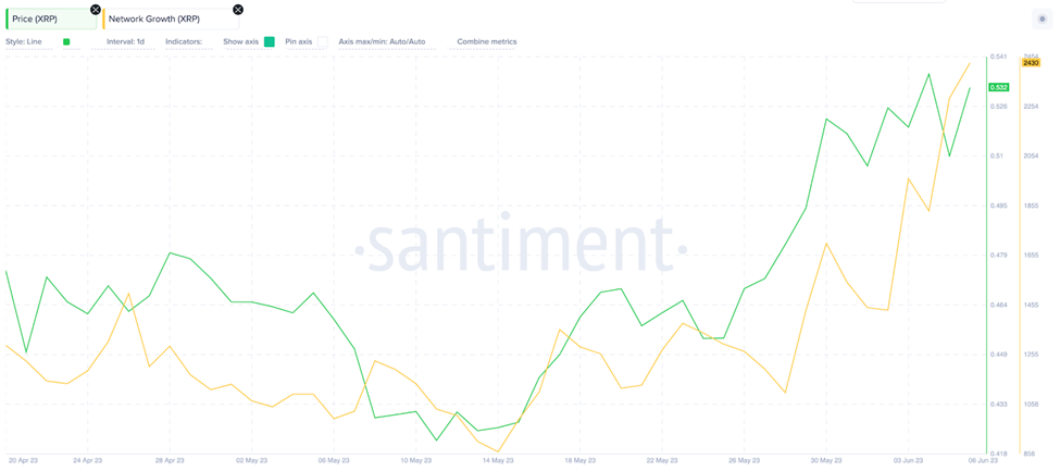 O crescimento da rede aumentou desde 14 de maio, quando 865 novos endereços de carteira foram criados na blockchain Ripple. Notavelmente, esse número mais do que triplicou, chegando a 2.430 novos endereços na última terça-feira (6).
