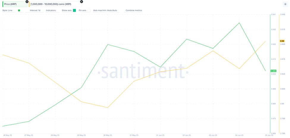 Entre 30 de maio e 6 de junho, as baleias XRP com um milhão a 10 milhões de moedas aumentaram suas participações. O gráfico abaixo mostra como elas adicionaram 100 milhões de moedas no valor de quase US$ 53 milhões apenas nos últimos 7 dias de negociação.