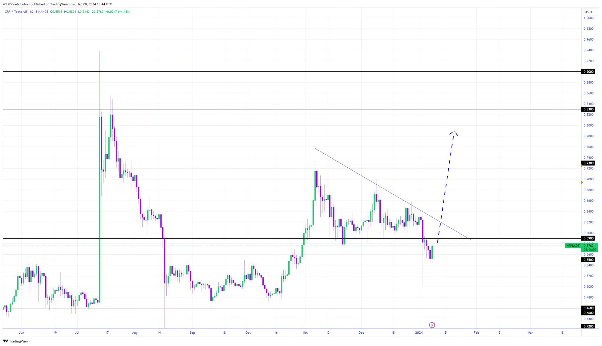 Analistas e traders de criptomoedas no X acreditam que o XRP iniciará uma tendência de alta. CryptoWZRD sugere que um rompimento da linha de tendência de baixa impulsionará o preço em direção a US$ 0,75.