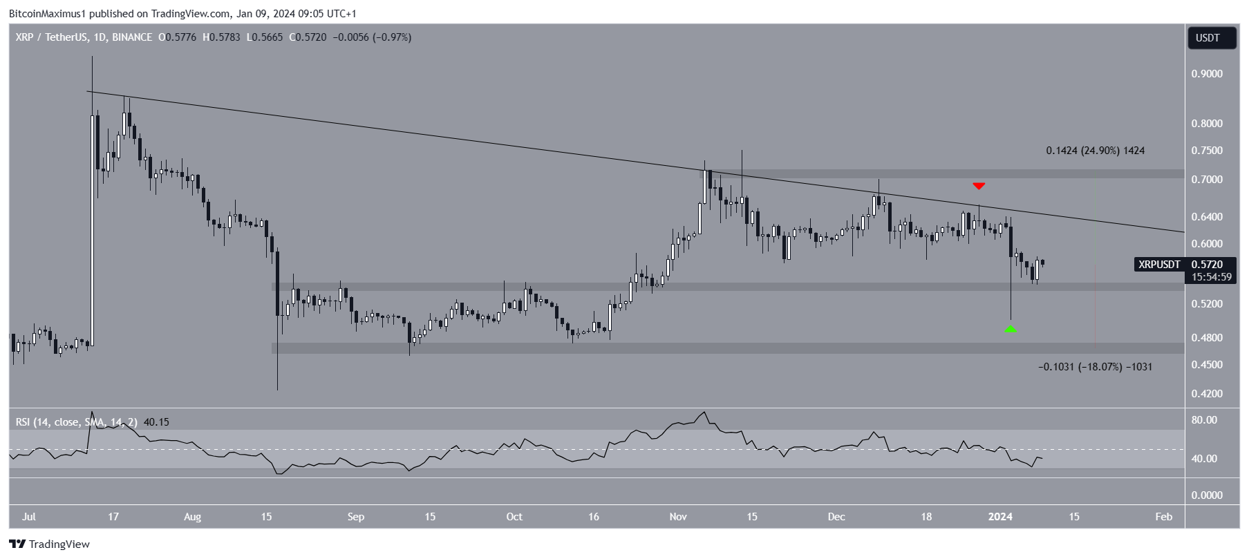 SponsoredA ação do preço mostra que o XRP caiu sob uma linha de tendência de baixa de curto prazo desde julho de 2023. A linha foi validada inúmeras vezes, a mais recentemente em dezembro (ícone vermelho).