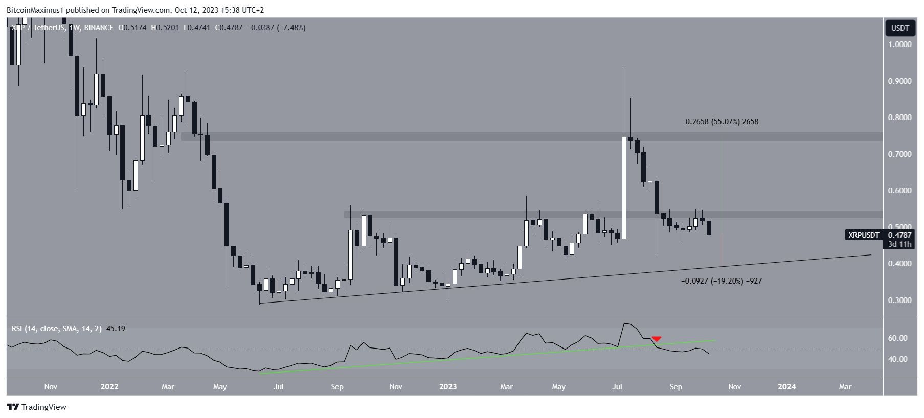 Nesse cenário, o preço do XRP poderia subir 55% e atingir o próximo nível de resistência em US$ 0,75.
