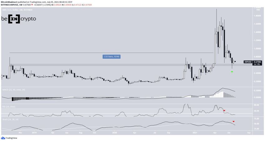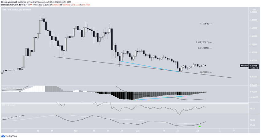 O gráfico diário mostra que o preço do XRP tem caído junto de uma linha de suporte decrescente desde o dia 23 de abril. Até agora, a linha foi tocada várias vezes, sendo a mais recente no dia 22 de junho.