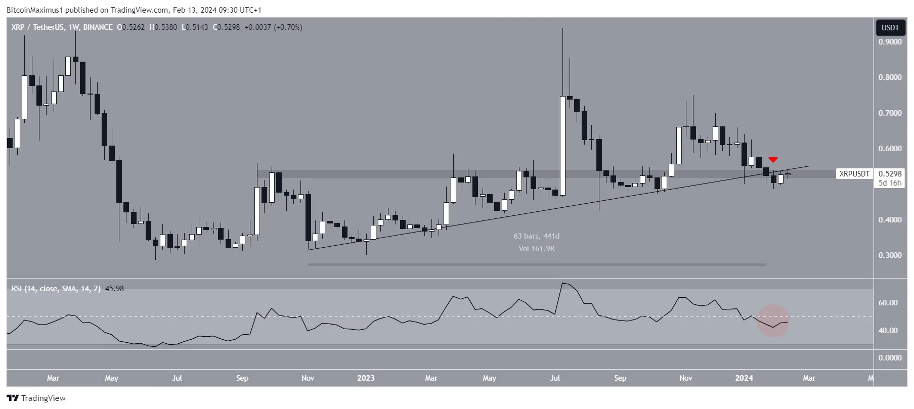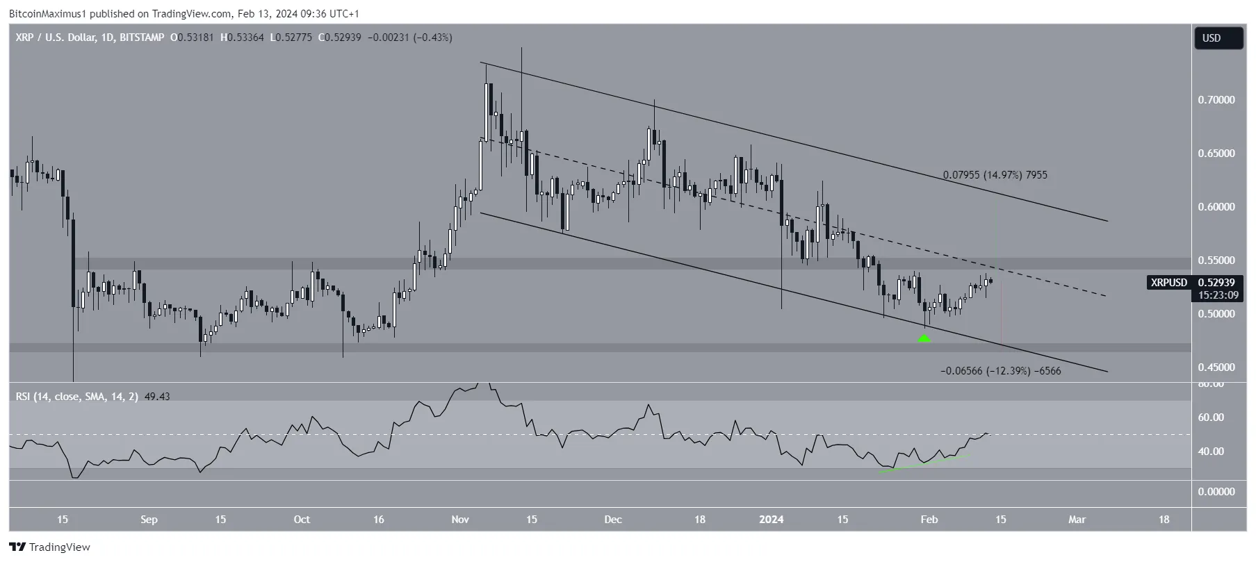 O preço do XRP subiu ao longo de uma linha de tendência de alta nos últimos 440 dias. O movimento levou a uma máxima de US$ 0,94 em julho de 2023.
