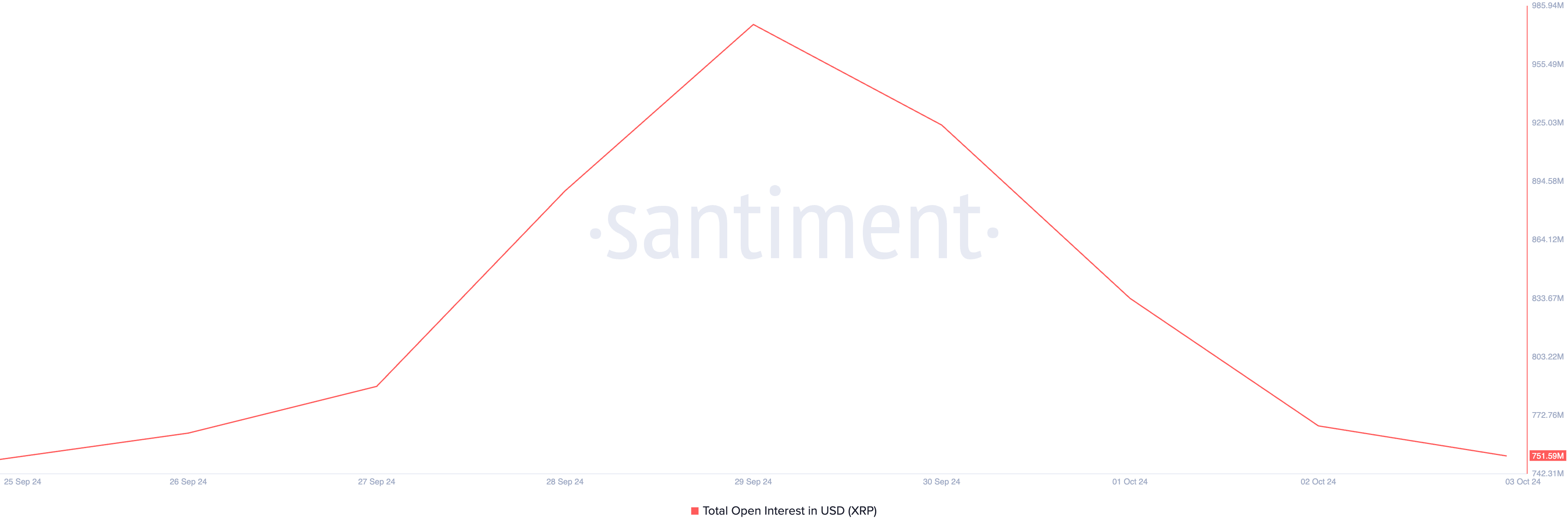 Além disso, a queda no interesse aberto do XRP destaca a demanda decrescente pela altcoin, um padrão observado nos últimos dias. O interesse aberto do token atualmente está em US$ 752 milhões, refletindo uma queda de 23% desde 29 de setembro.