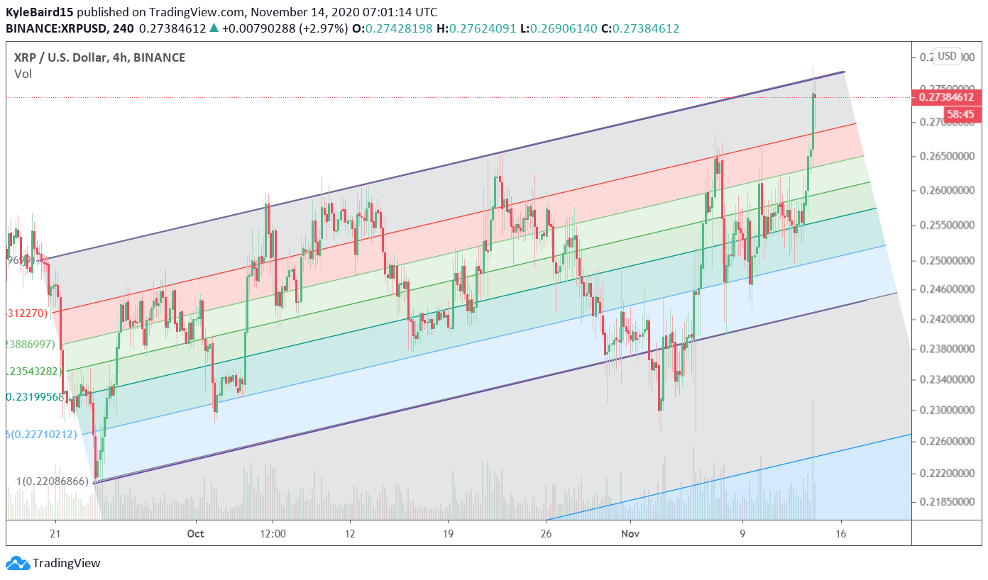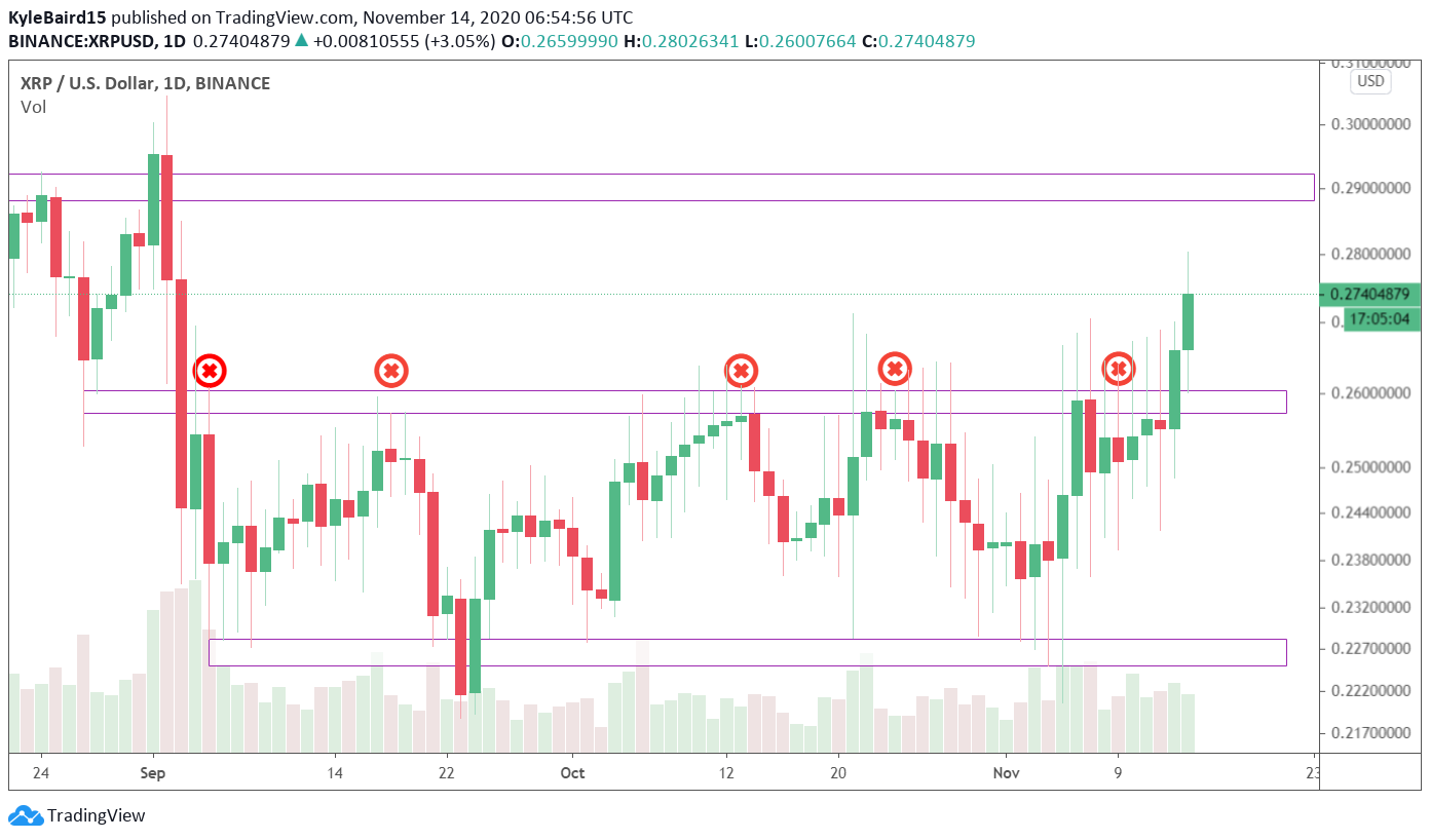 Ontem, a XRP finalmente fechou um candle diário acima dessa faixa em $ 0,265. Ele continuou subindo nas primeiras horas da manhã para chegar a $ 0,28, mas desde então recuou para $ 0,272.