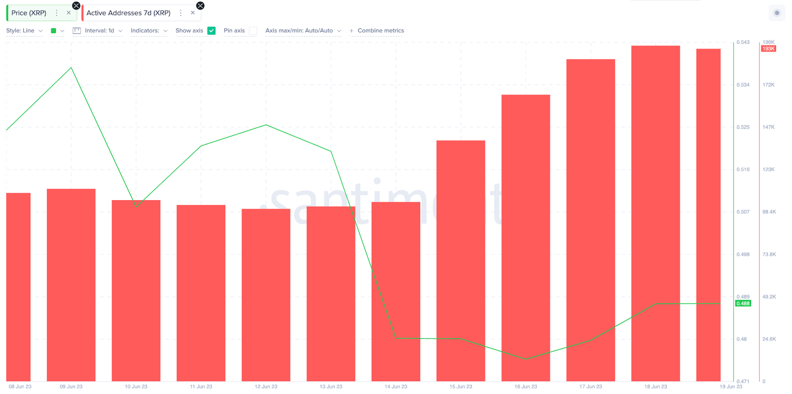 No entanto, a XRP melhorou constantemente o valor da rede subjacente esta semana. Entre 14 e 19 de junho, os endereços ativos diários do XRP (DAA 7d) quase dobraram de 104.250 para 193.700. Isso representa um crescimento de 85% na demanda de rede em menos de uma semana.