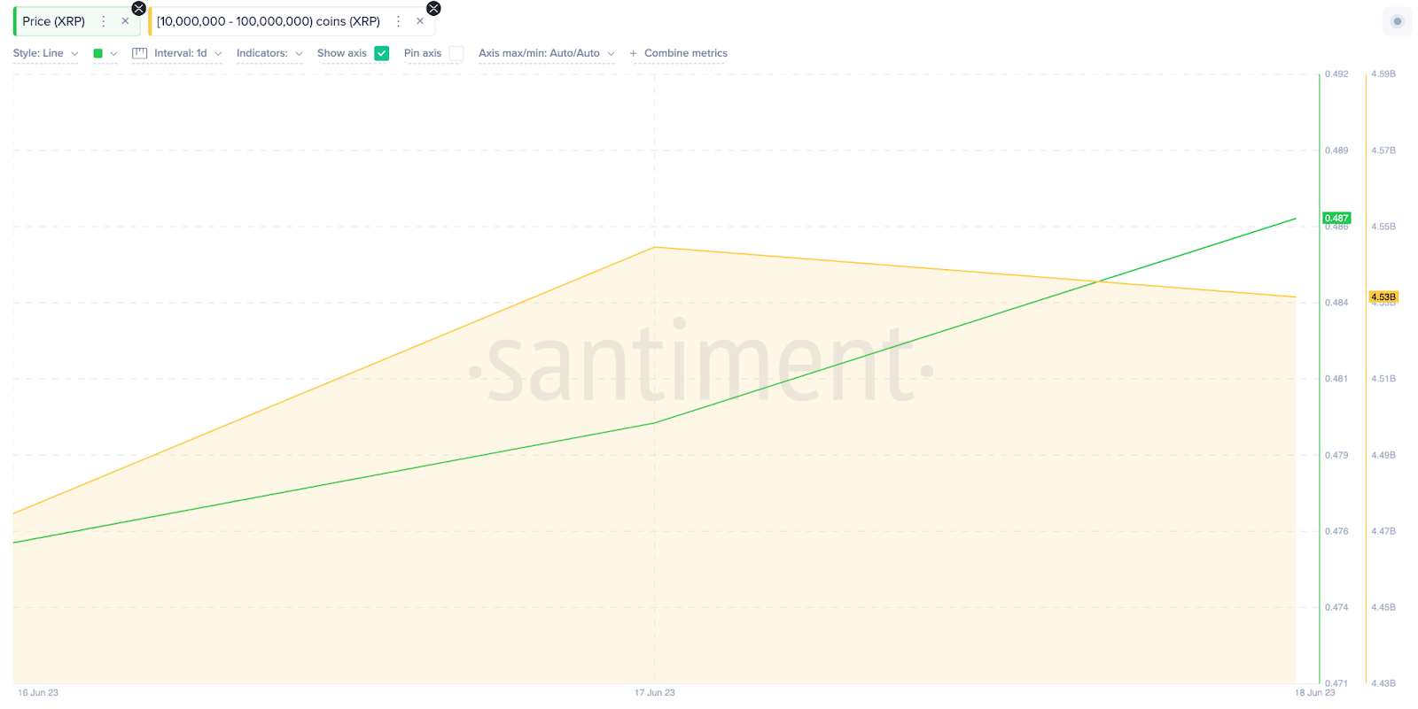 Os dados on-chain mostram que um grupo de grandes investidores, com 10 milhões a 100 milhões de moedas XRP, está atualmente em uma onda de compras. O gráfico da Santiment abaixo ilustra que eles compraram 90 milhões de moedas no fim de semana.