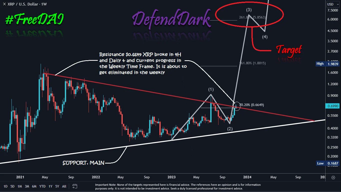 Os analistas no X têm uma visão predominantemente otimista sobre o futuro do XRP. DefendDark usa a teoria de Elliott para sugerir que o preço atingirá um novo recorde histórico.