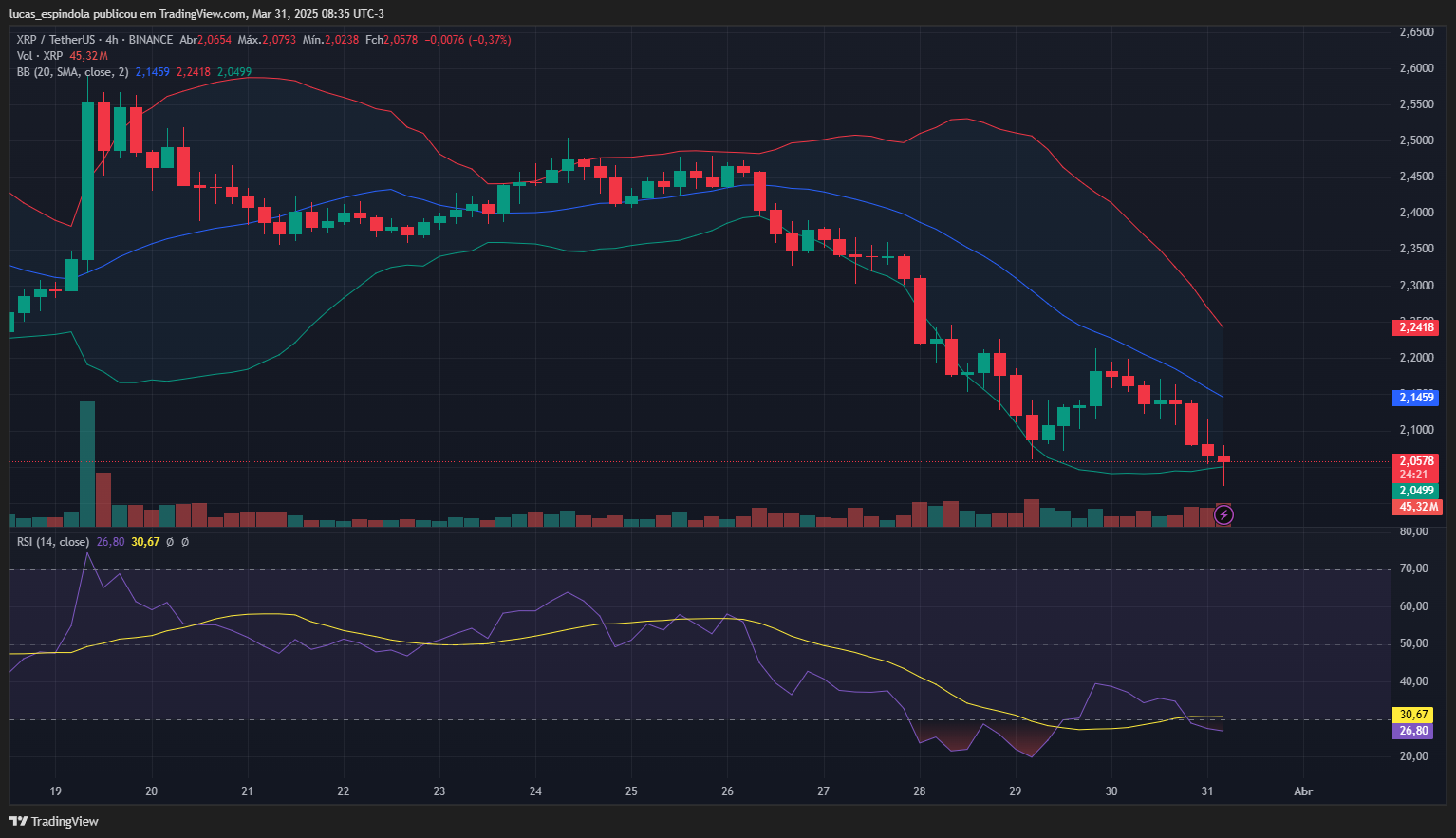 O preço do XRP iniciou a segunda-feira (31) tentando se estabilizar após registrar quedas consecutivas. No momento, o ativo é negociado a US$ 2,0564, com recuo de 0,44% nas últimas quatro horas. O gráfico de 4h revela forte pressão vendedora no final de semana, com o XRP rompendo a zona de suporte em US$ 2,10 e se aproximando da borda inferior das Bandas de Bollinger, o que pode sinalizar um movimento de sobrevenda.
