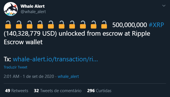 A subida de preço coincidiu com o destravamento de 1.000.000 de XRP por parte da Ripple. A operação foi flagrada pelo monitor Whale Alert. A Ripple disponibilizou a quantidade em duas operações de 500.000 XRP. Na cotação da manhã desta terça-feira (1), o montante corresponde a cerca de US$ 290 milhões, ou R$ 1,5 bilhão.