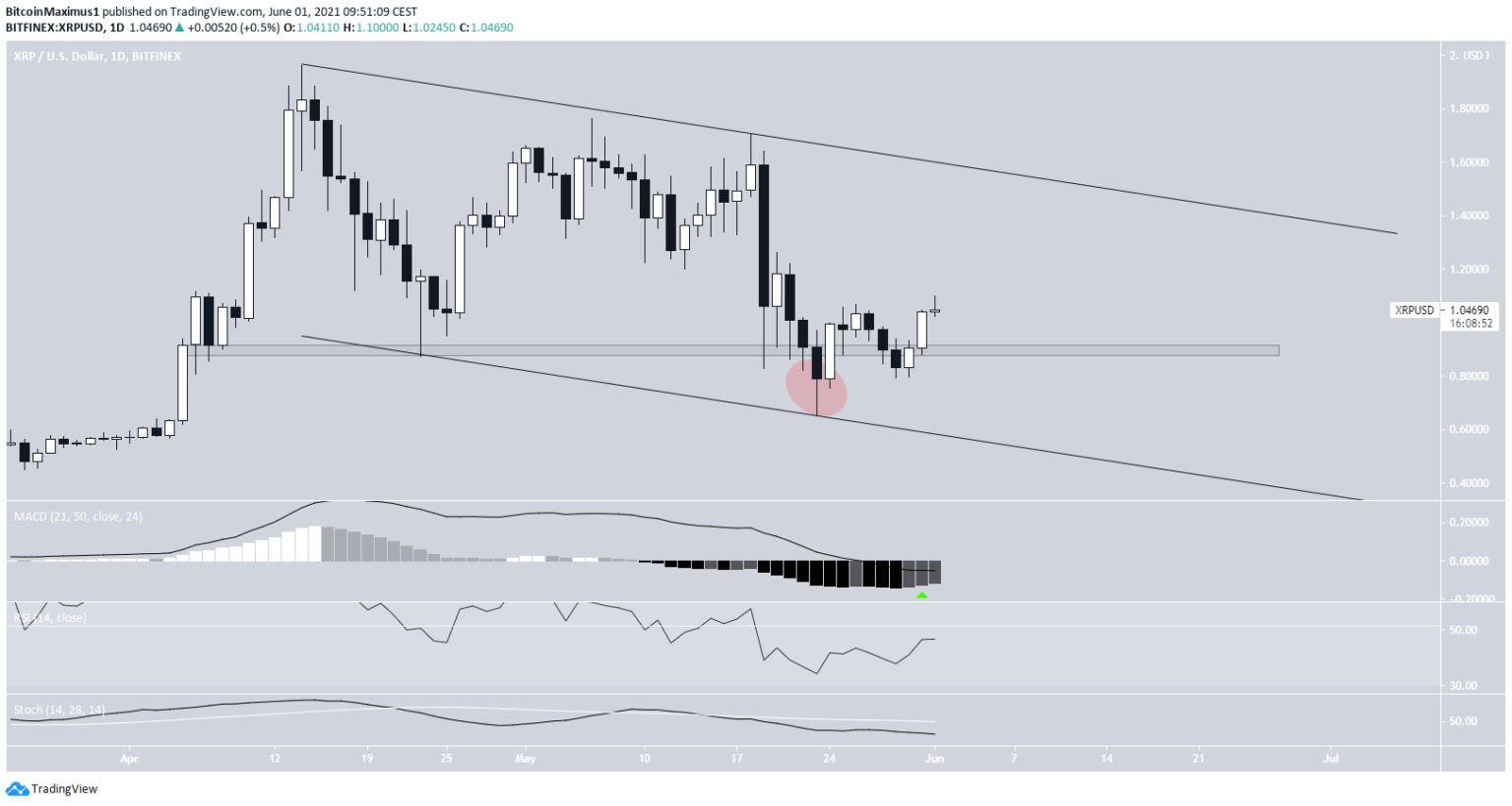 Movimentando-se dentro do canal, a XRP caiu abaixo da área de suporte de US$ 0,90. No entanto, voltou a subir no dia 23 de maio (círculo vermelho) e tem valorizado desde então. Isso transforma o rompimento anterior em um desvio, o que provavelmente levará a um movimento do preço na outra direção.
