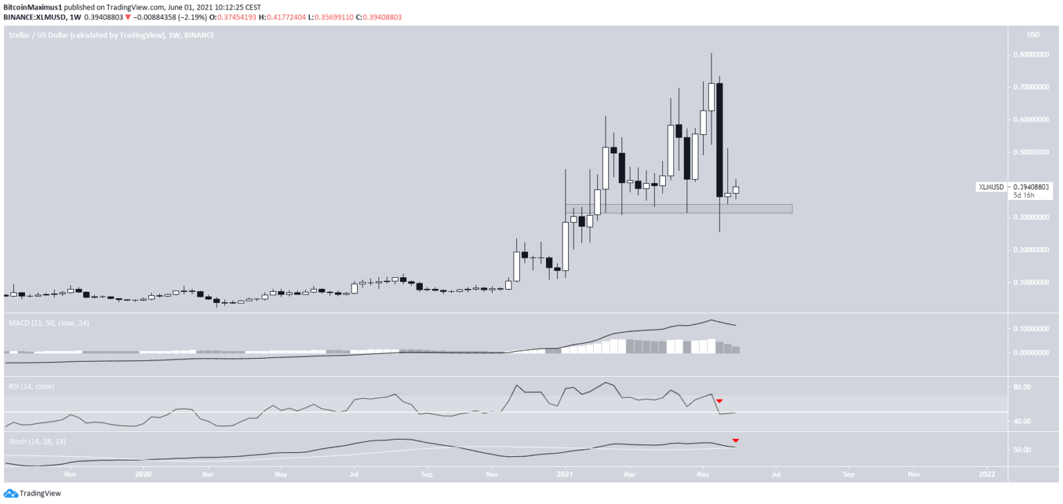 O gráfico semanal mostra que a XLM caiu consideravelmente na segunda metade de maio, chegando à mínima de US$ 0,256. No entanto, ela recuperou a área de US$ 0,325 logo depois, validando-a como suporte novamente.
