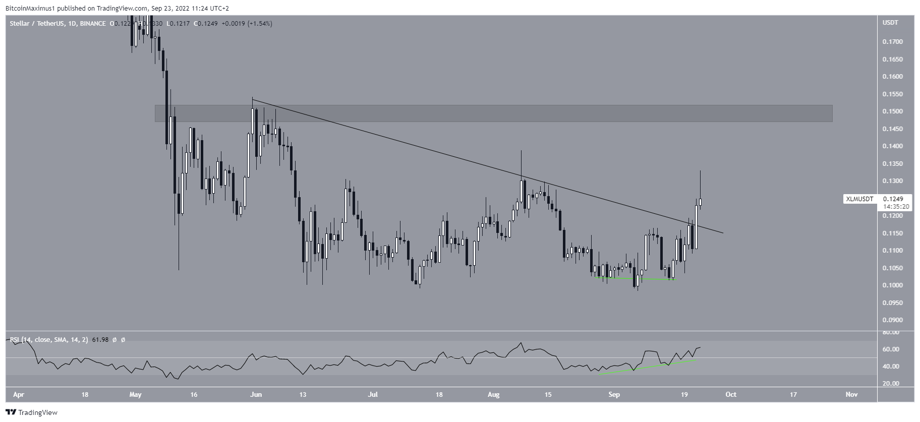 A XLM vinha caindo abaixo de uma linha de resistência descendente desde o início de junho. Esse movimento descendente levou a uma baixa de US$ 0,098 em 7 de setembro.