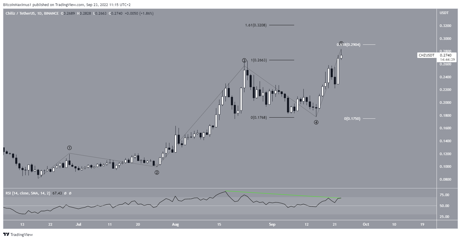 A CHZ vem aumentando desde que atingiu uma mínima de US$ 0,018 em 18 de junho. Parece que está na onda cinco desse movimento ascendente de cinco ondas. CHZ atingiu atualmente o comprimento de retração 0,618 de Fibonacci das ondas 1 a 3 (branco). Esta é uma área que poderia atuar como o topo.