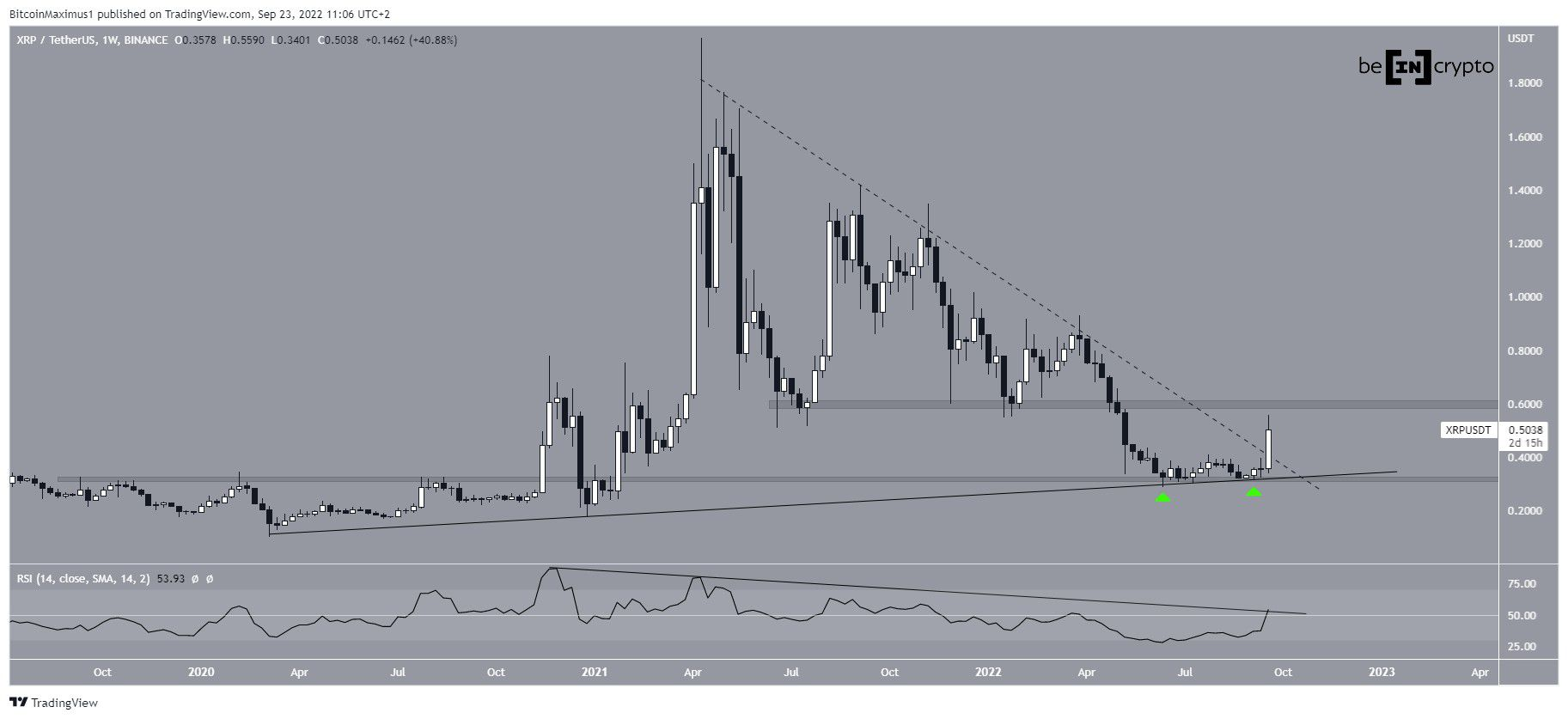 Em junho e setembro, o XRP saltou em uma linha de suporte ascendente de longo prazo e na área de suporte horizontal de US$ 0,32 (ícones verdes). Depois, iniciou um forte movimento ascendente e rompeu uma linha de resistência descendente de longo prazo (tracejada).