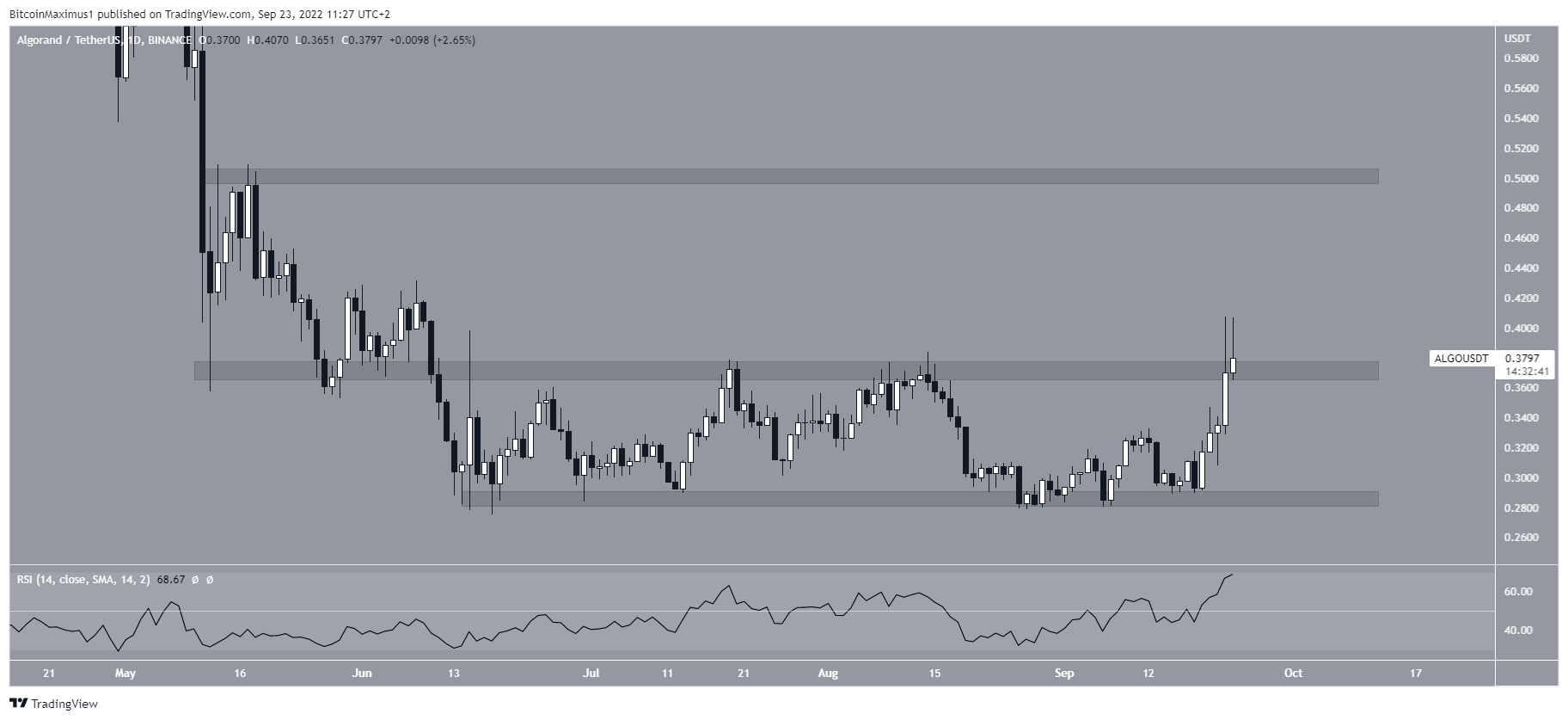 Atualmente, ALGO está em processo de romper a linha de resistência. O RSI diário já estourou, então é provável que o preço siga o exemplo.